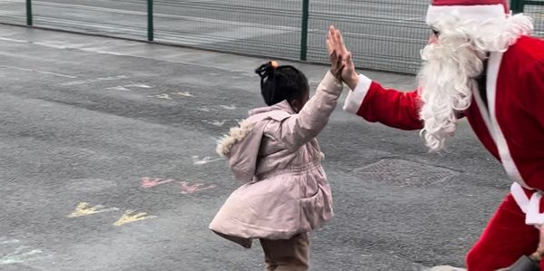 throughout the day, giving children high fives and encouragement as they ran around the yard. Our DJ Amanda was brilliant playing festive tunes over the intercom. Our senior classes took to the hall when it began to rain where they became reindeers galloping through the sky helping Santa pull his heavy sleigh!